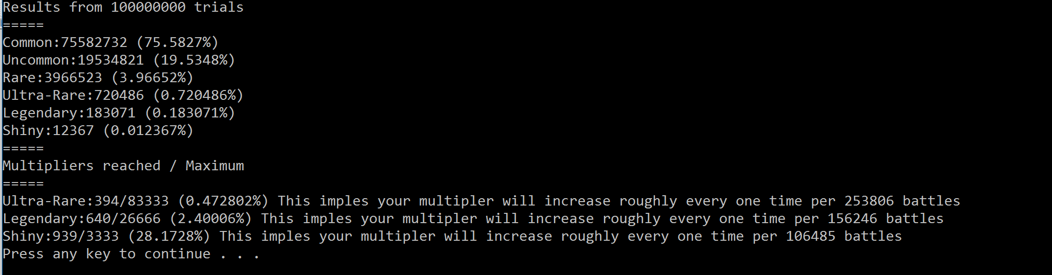 This is where it gets whacky, I ran a simulation of 100 Million encounters (percents and multipliers working correctly, picture attached) and the results seem to imply that getting your encounter multiplier above 0x is so rare that it may as well not even be a feature.