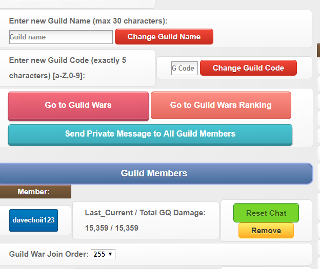 38.1: Now you can set a member to be ignored from participating Guild Wars both attacking and defending if you set member's Guild War join order to 255.