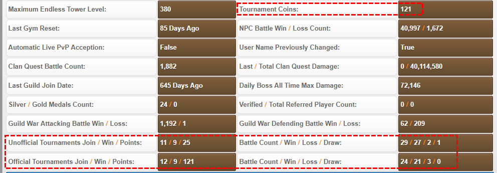 21: Every statistics of your Tournaments history can be found in your profile page as below > https://www.pokemonpets.com/profile.aspx