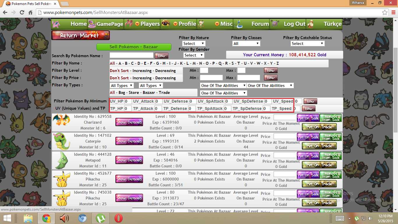 The following is a screenshot from the 'PUT POKEMON ON TRADE' option in the shop shouldn't UV be changed to EV and TP be changed to whatever it means.